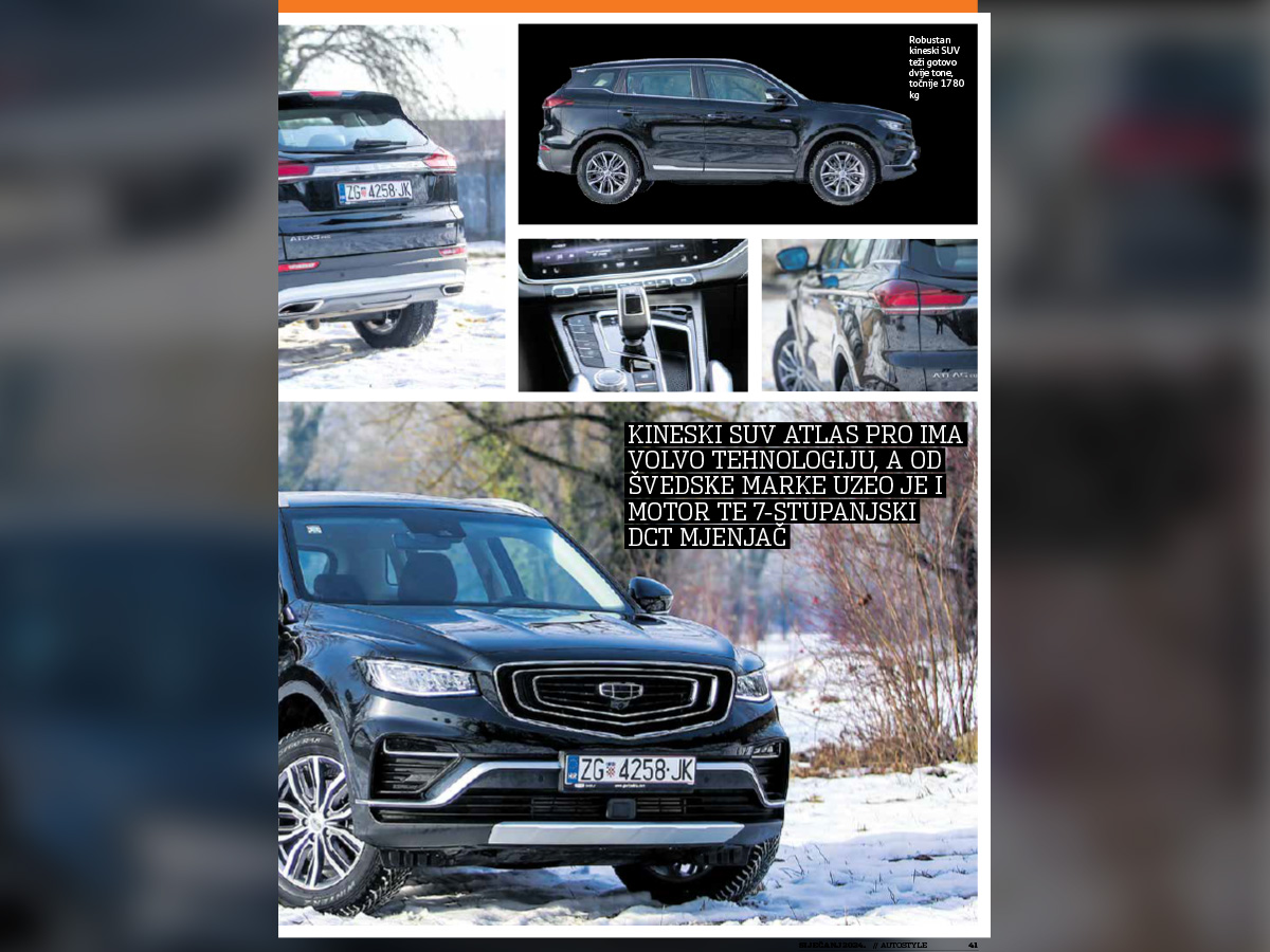 Sad smo već u fazi kad kineski automobil na hrvatskim cestama nije svjetsko čudo, a sve je manje i onih koji viču "nikad kineza", bez da su i sjeli za upravljač nekog od modela pristiglog iz Kine. A markama koje su tu otprije na samom se kraju 2023. godine pridružio Geely, jedan od najjačih svjetskih proizvođača automobila, najprodavanija marka osobnih vozila u Kini, vlasnik švedskog Volva, većinski vlasnik britanskog Lotusa, a u njegovu je posjedu i tek nešto manje od deset posto dionica Daimler AG-a. Za Geely u Hrvatskoj najbitnija je, pak, stavka da je ovaj automobilski div vlasnik Volva, poznatog po kvaliteti i sigurnosti. Model s kojim Geely u Hrvatskoj radi prve korake, SUV Atlas Pro, ima Volvo tehnologiju, Volvo motor i Volvo 7-stupanjski DCT automatski mjenjač s dvostrukom spojkom. Motor je 1,5-litreni T-GDI turbobenzinski stroj sa snagom 132 kW (177 KS). S 48-voltnim EMS (Electric Motor Synergy) sustavom ima 140 kW (190 KS) te najveći okretni moment od 300 Nm već pri 1500 o/min. Deklarirano na 100 km troši 6,8 litara, nama je trošio 7,6 l/100 km.